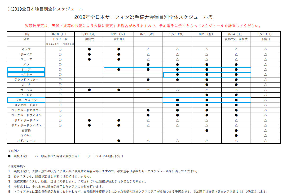 第54回全日本選手権大会開催にあたりWestsurfco.臨時休業のお知らせです。 未選択 2019年08月19日 令和元年2019NSA第54回全日本選手権大会開催にあたりWestsurfco.臨時休業のお知らせです。ご迷惑をお掛けしますが下記の日程ご確認の上ご理解の程よろしくお願いします。 ◆開催期間:8月19日(月)~24日(土) ◆臨時休業期間:8月22日(木)~24日(土) ◆場所:四国東陽町生見海岸 ◆TEAM Westsurfco.×3名 種目別スケジュール ◆シニアクラス 20日(水)H-33MASA ◆シニアウィメン 22日(木) H-8 SAYAKA ◆マスターH-15 22日(木)TAKASE ◆スモールコンディションが予想されるので、最近乗りまくっている絶好調な高瀬のマジックボードNEW MODEL CFL2 5'7"を準備。ご存知の方も.。ほんと良い板です(新動画MOVIE今しばらくお待ち下さい。) そして、今年より全クラスに「プライオリティールール」が採用されるようで、まだまだ肩を負傷中の高瀬には、怪我の功名はこのことかと自負前向きに考えております。 ◆ルール内容は、一言でいいますと、波を取り合うのではなく順番に乗りなさい。な感じです。 ご興味のある方は↓↓参考に 複雑な戦術もありますが、今の自分を信じ、できることだけに集中し、サーフィンを通じ一人でも多くの方へ「自分と向き合う心、夢、楽しさ」をお届けできるよう頑張ってきます。 同時にTEAM Westsurfco.から近未来この全日本舞台へ出場し活躍する選手を輩出できるよう必要に応じた育成も取り組んでいきたい所存です。「継続は力なり。こつこつと積み上げていって下さいね」 ◆開催期間中はLIVE配信ABC各ポイントもあるようなのでご興味のある方はこちらから →→→ LIVE NAMIARU TV PR http://westsurfco.blog.shinobi.jp/%E6%9C%AA%E9%81%B8%E6%8A%9E/20190817第54回全日本選手権大会開催にあたりWestsurfco.臨時休業のお知らせです。