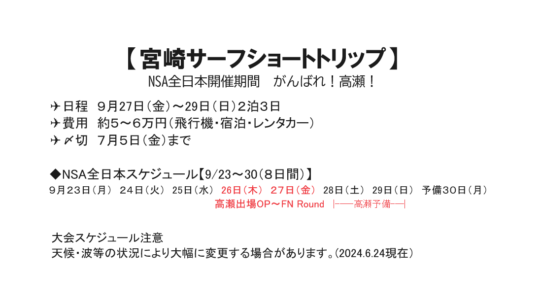 宮崎サーフショートトリップ 未選択 2024年06月24日 NSA全日本出場にあたり恐縮ではありますが宮崎サーフトリップを開催企画させていただきます。日程は下記の内容となりますが、予定通り大会が進行すれば、高瀬は28日(土)からフリー行動へ移れると思います。ご興味のある方は、是非この機会に宮崎を一緒に楽しみましょう!*トリップ日程に関しましては、調整可能となりますのでお気軽にご質問下さい。PR http://westsurfco.blog.shinobi.jp/%E6%9C%AA%E9%81%B8%E6%8A%9E/%E5%AE%AE%E5%B4%8E%E3%82%B5%E3%83%BC%E3%83%95%E3%82%B7%E3%83%A7%E3%83%BC%E3%83%88%E3%83%88%E3%83%AA%E3%83%83%E3%83%97宮崎サーフショートトリップ