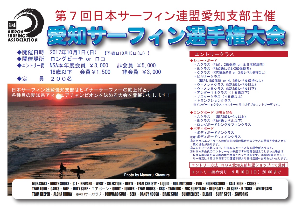 各サーフィンコンテスト受付スタート 未選択 2017年08月27日 ◆NSA愛知サーフィン選手権大会 ◆ASU#2 10月8日(日)予備22(日) エントリ受付9/1~coming soon. 夏の練習の成果をためしてみませんか!お気軽にご質問下さい。 http://westsurfco.blog.shinobi.jp/%E6%9C%AA%E9%81%B8%E6%8A%9E/%E5%90%84%E3%82%B5%E3%83%BC%E3%83%95%E3%82%A3%E3%83%B3%E3%82%B3%E3%83%B3%E3%83%86%E3%82%B9%E3%83%88%E5%8F%97%E4%BB%98%E3%82%B9%E3%82%BF%E3%83%BC%E3%83%88各サーフィンコンテスト受付スタート