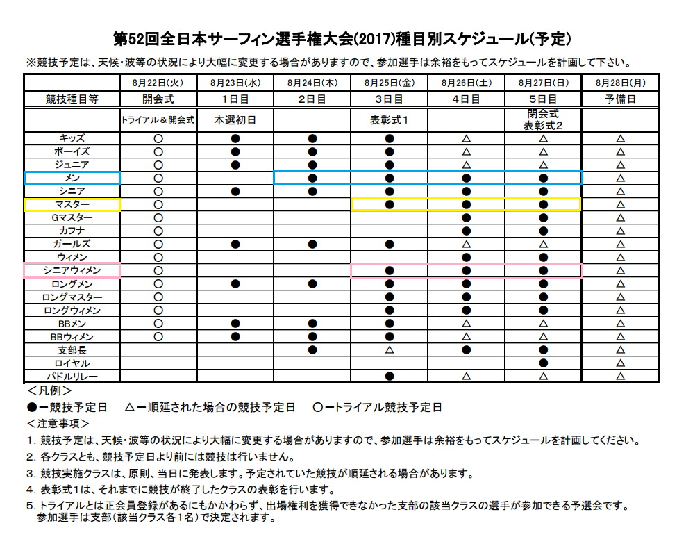第52回全日本選手権サーフィン大会ヒート表公開 未選択 2017年08月20日 第52回全日本選手権サーフィン大会ヒート表公開となりました。 種目別スケジュールはこちら(*期間中はWestsurfco.変則営業・現地レポートをSHOP BLOGからお届け予定) TEAM Westsurfco.3名出場 ★メンクラスR1 H18 RED野村昌宏 ★マスタークラスR1 H5 RED高瀬俊明 ♥シニアウィメンR1 H6 WHITE松尾佐夜佳 静岡県豊浜海岸 会場案内図 その他の各ヒート表はhttp://www.nsa-surf.org/news/20170818_05/PR http://westsurfco.blog.shinobi.jp/%E6%9C%AA%E9%81%B8%E6%8A%9E/%E7%AC%AC52%E5%9B%9E%E5%85%A8%E6%97%A5%E6%9C%AC%E9%81%B8%E6%89%8B%E6%A8%A9%E3%82%B5%E3%83%BC%E3%83%95%E3%82%A3%E3%83%B3%E5%A4%A7%E4%BC%9A%E3%83%92%E3%83%BC%E3%83%88%E8%A1%A8%E5%85%AC%E9%96%8B第52回全日本選手権サーフィン大会ヒート表公開
