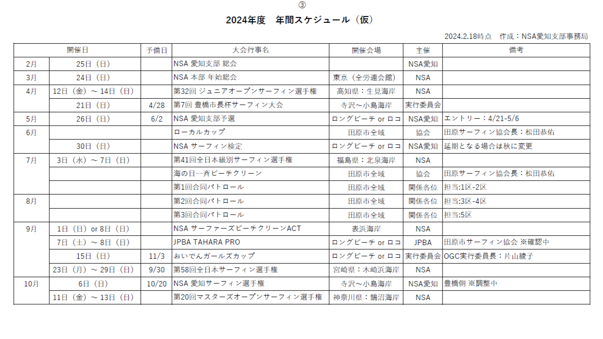 2024 NSA愛知支部 年始総会へ行ってきました! イベント情報 2024年02月25日 今日現在の 仮年間スケジュールとなります。*今年より全日本出場クラスに編成があります。現在は未定ですが、今まであった各クラスの年齢差の開きを縮め、全体で約30カテゴリー増(細分化)を図り、より良質な選手であったり白熱した大会が行えるよう調整しているそうです。これは新改革ですね。 http://westsurfco.blog.shinobi.jp/%E3%82%A4%E3%83%99%E3%83%B3%E3%83%88%E6%83%85%E5%A0%B1/2024%20nsa%E6%84%9B%E7%9F%A5%E6%94%AF%E9%83%A8%20%E5%B9%B4%E5%A7%8B%E7%B7%8F%E4%BC%9A%E3%81%B8%E8%A1%8C%E3%81%A3%E3%81%A6%E3%81%8D%E3%81%BE%E3%81%97%E3%81%9F%EF%BC%812024 NSA愛知支部 年始総会へ行ってきました!