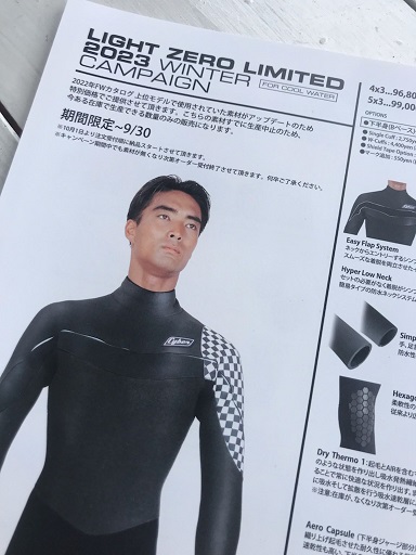 一足先に「秋冬新作CYBER」2023WETSUITS ORDER FAIR開催! 2023 WINTE CATALOG完成してきました。 話題沸騰中のLIGHT ZERO FIVE NINTHS4×3 MODELは見開きに掲載されています。 期間限定キャンペーンリミテッドモデルもご用意されていますので フレッシュマンさんなど冬もサーフィンされたい方へおすすめです。